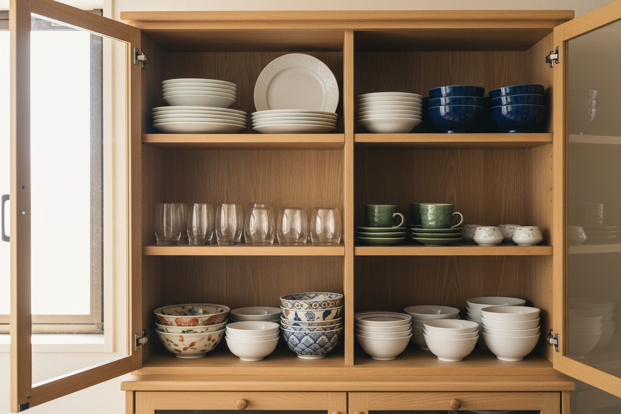 茶碗、マグカップ、取り皿は各2〜3枚あると洗い替えに便利。どんぶりや大きめの皿は1〜2枚あれば十分です。まずは少なめに揃えて、使いながら必要に応じて追加するのが賢い方法です。